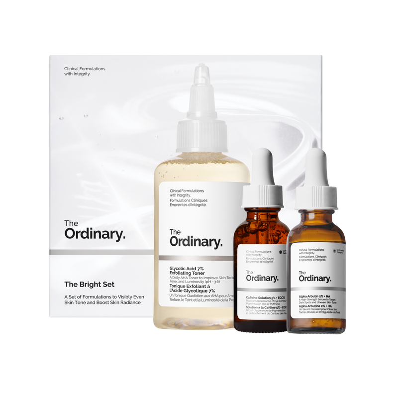 The Bright Set contains three targeted formulations that contain well-studied brightening ingredients to help visibly target uneven skin tone, while brightening dull skin.